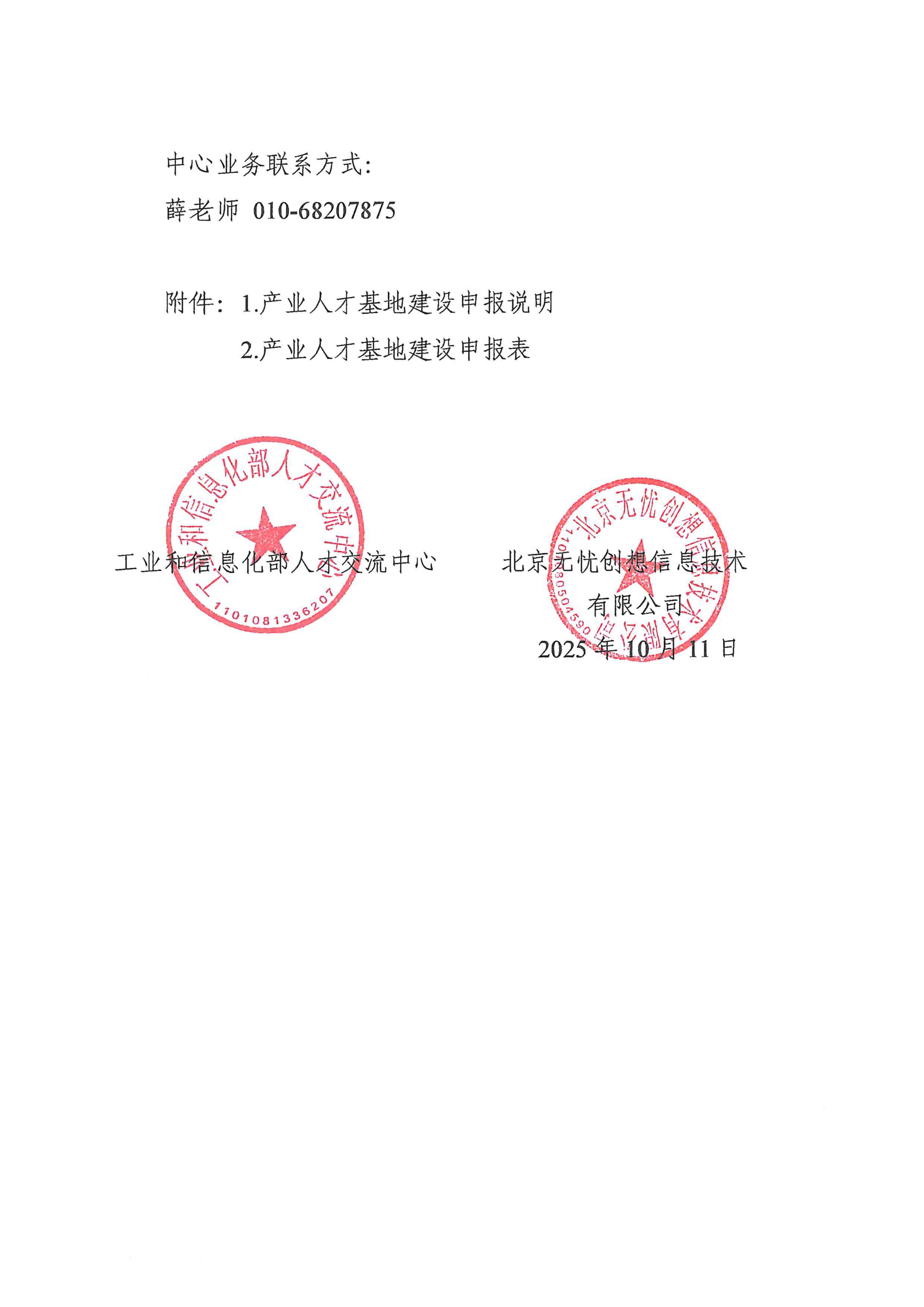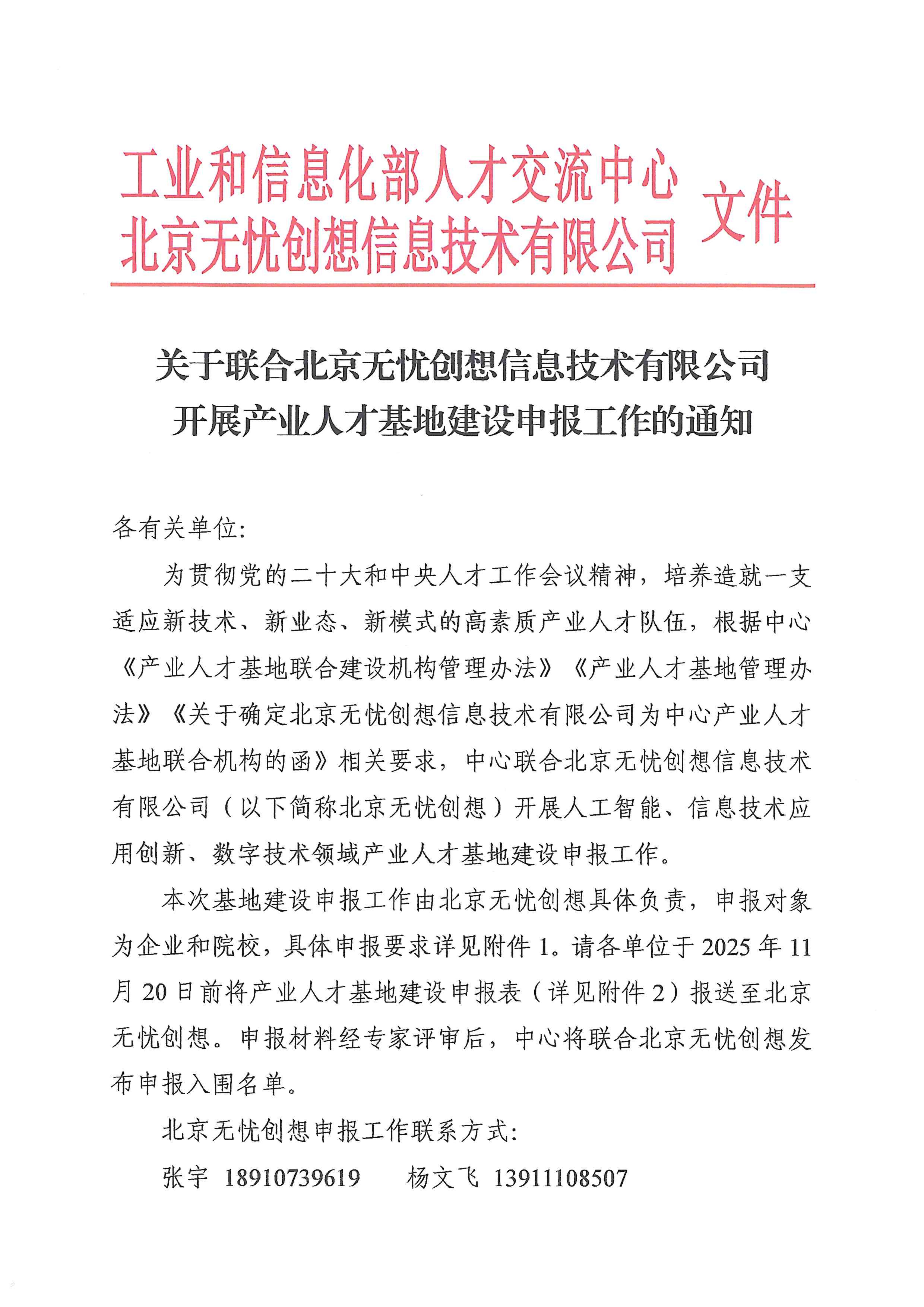 关于联合北京无忧创想信息技术有限公司开展产业人才基地建设申报工作的通知