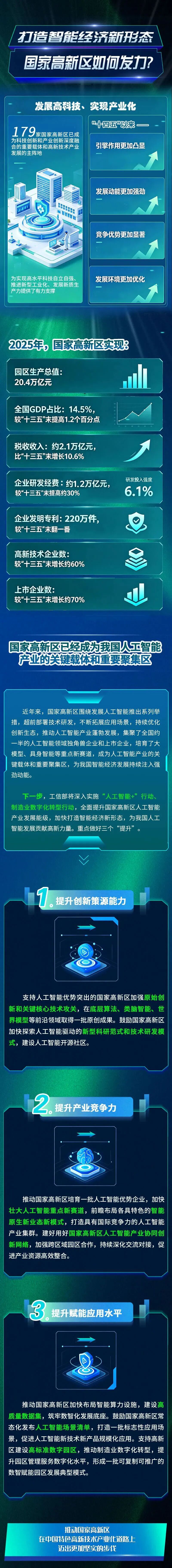国家高新区是加快实现高水平科技自立自强、引领发展新质生产力的重要载体,是推进新型工业化、建设现代化产业体系的关键阵地。在抓住人工智能发展机遇,“打造智能经济新形态”方面,国家高新区具备哪些基础和优势?国家主管部门又将如何部署推动?近日,工业和信息化部举行“推动国家高新区高质量发展”新闻发布会,提出将重点做好三个“提升”,加快打造智能经济新形态,为我国人工智能发展贡献高新力量。